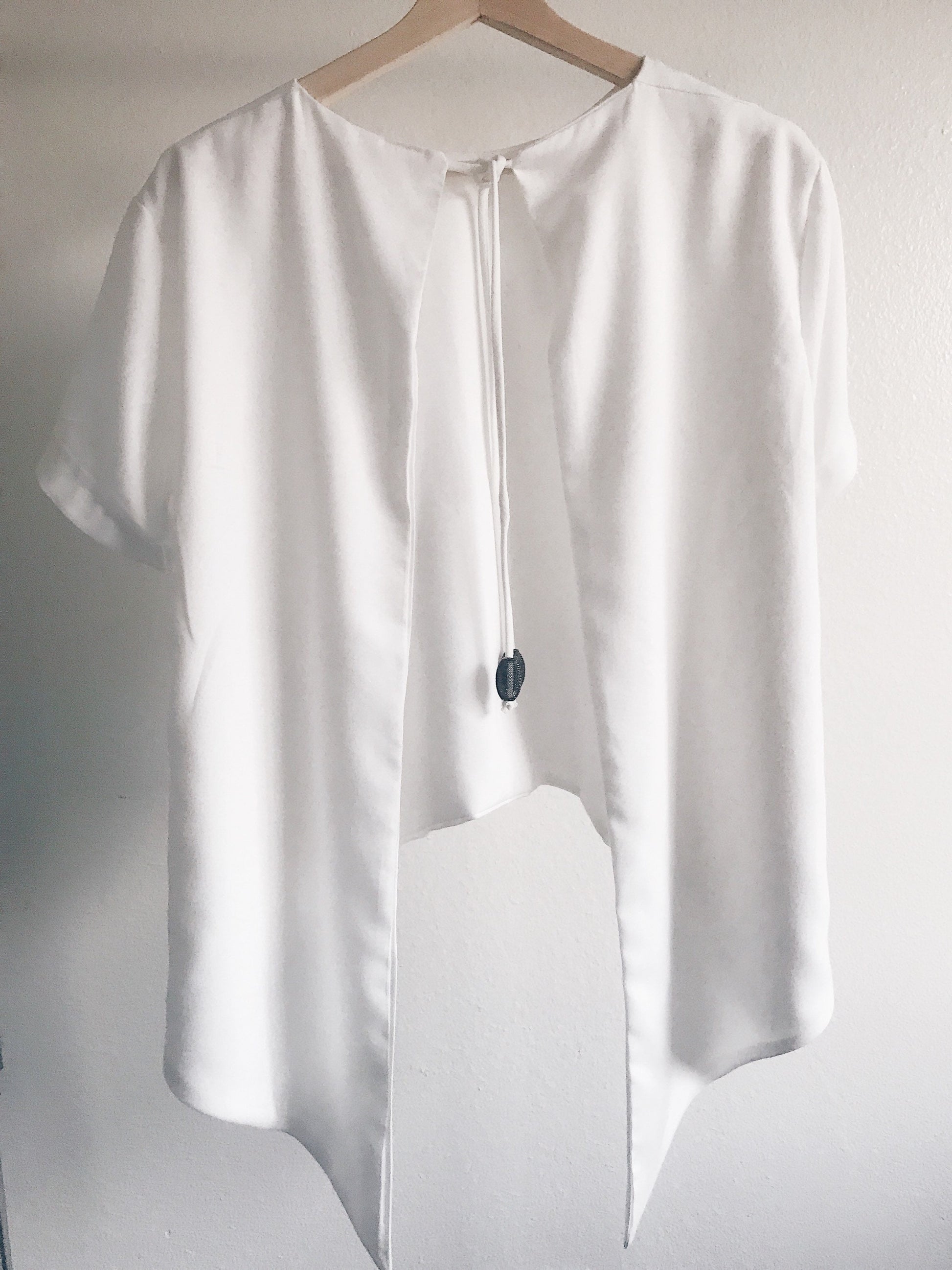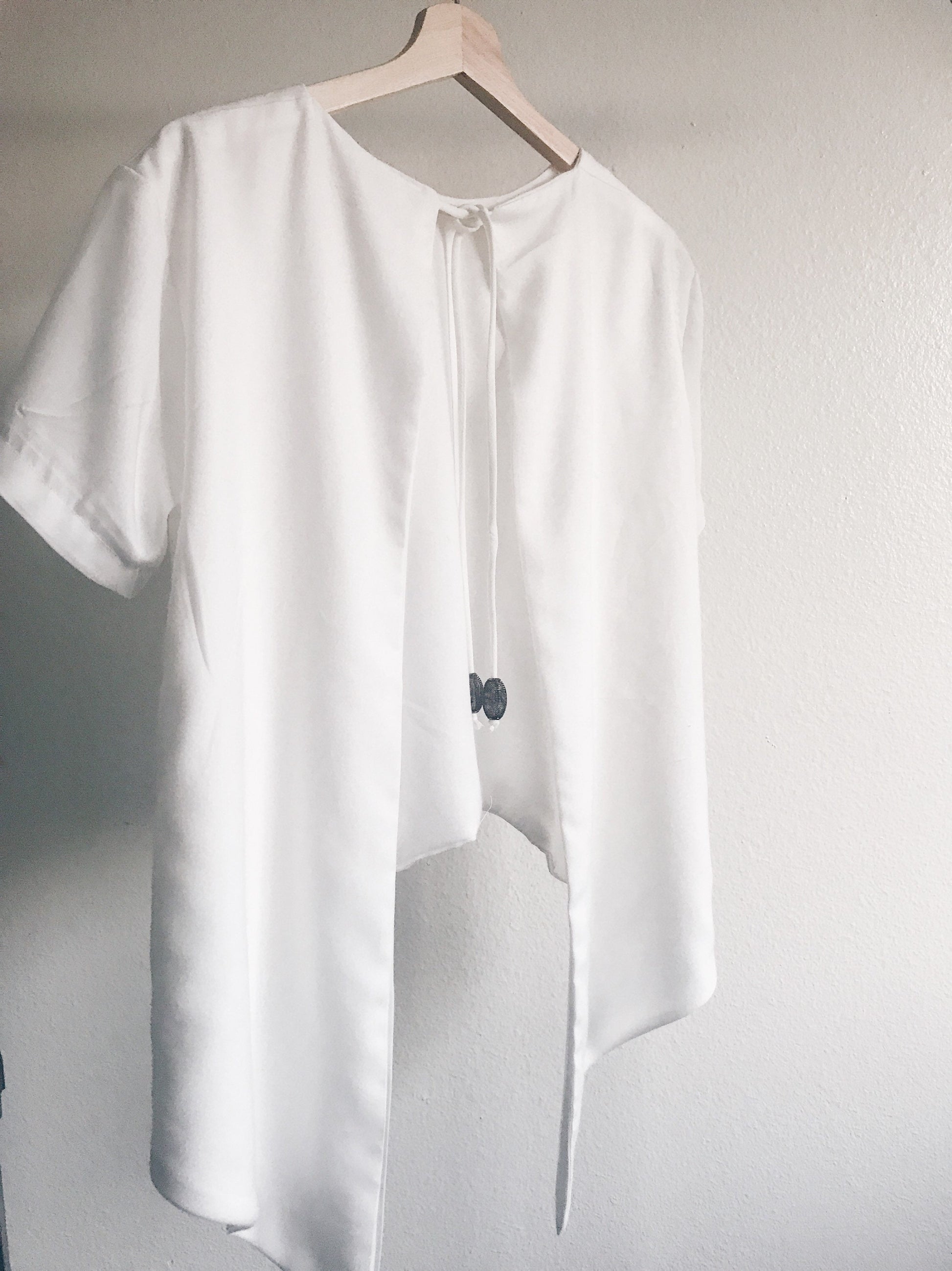 High-low open back blouse with ties. Silk-cotton. Perfect for layering or pairing with your favorite pants, skirt, or dress for a dramatic effect.